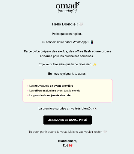 Omad’s sent email campaigns featuring Coco’s Magic Link, allowing subscribers to join a VIP WhatsApp channel in a single click. The emails clearly highlighted benefits such as exclusive offers, early access, and priority announcements—while minimizing friction.